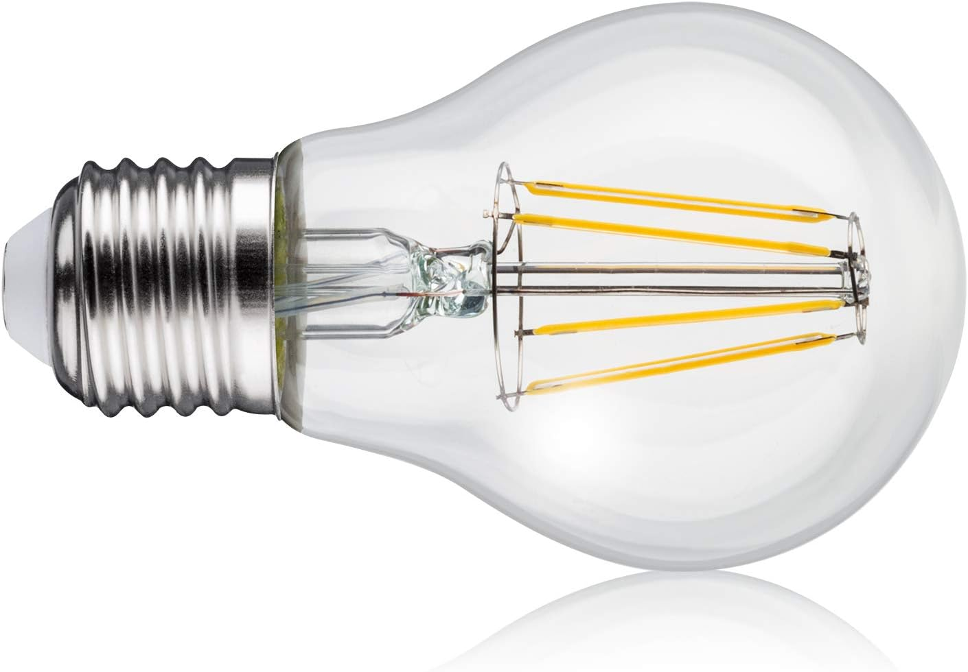 Som en slående retrodetalj har lampan smala LED-filament ordnade för klassisk Edison-stil. Deras varma 2700 K nyans skapar en tidlös visuell effekt inuti den klara glasformen.