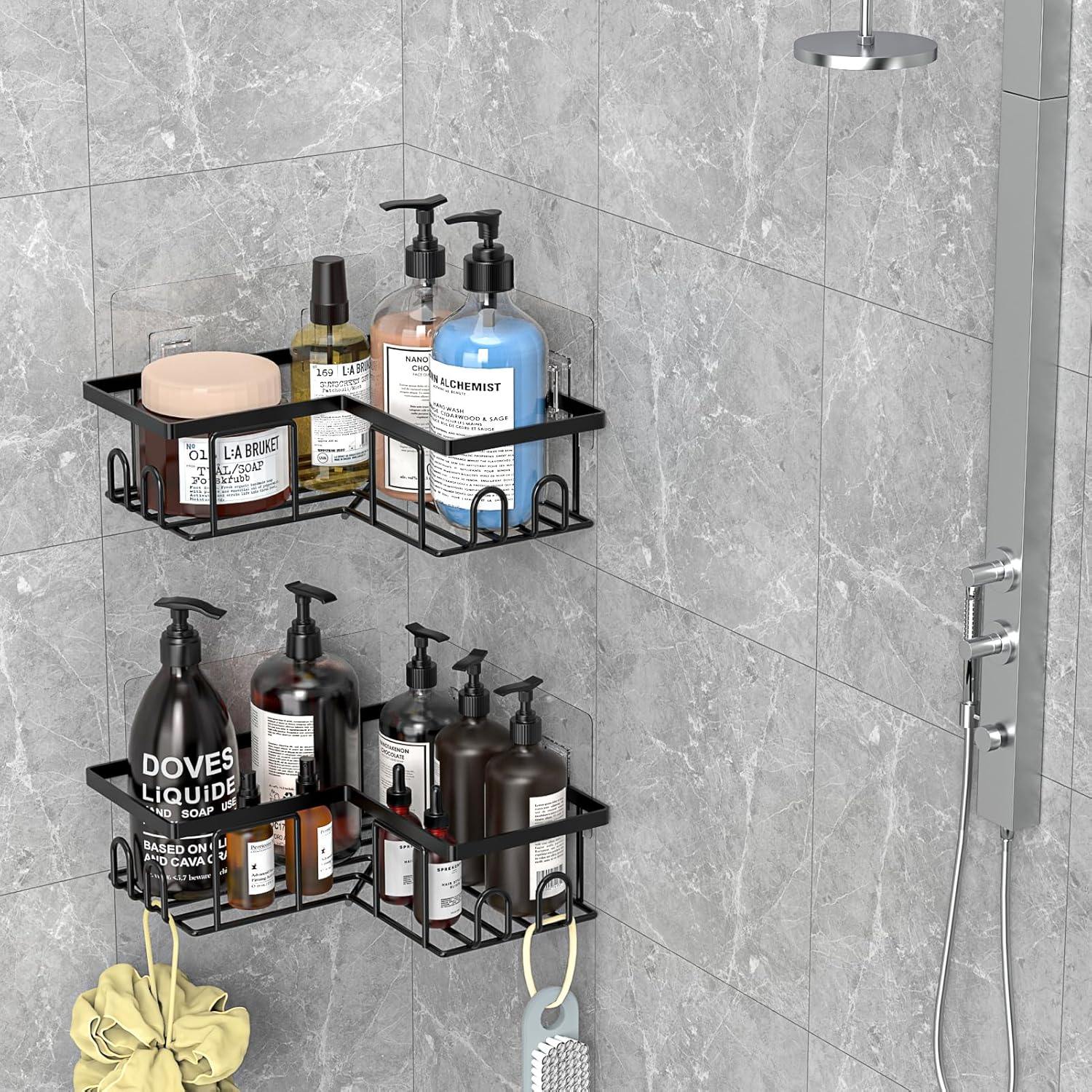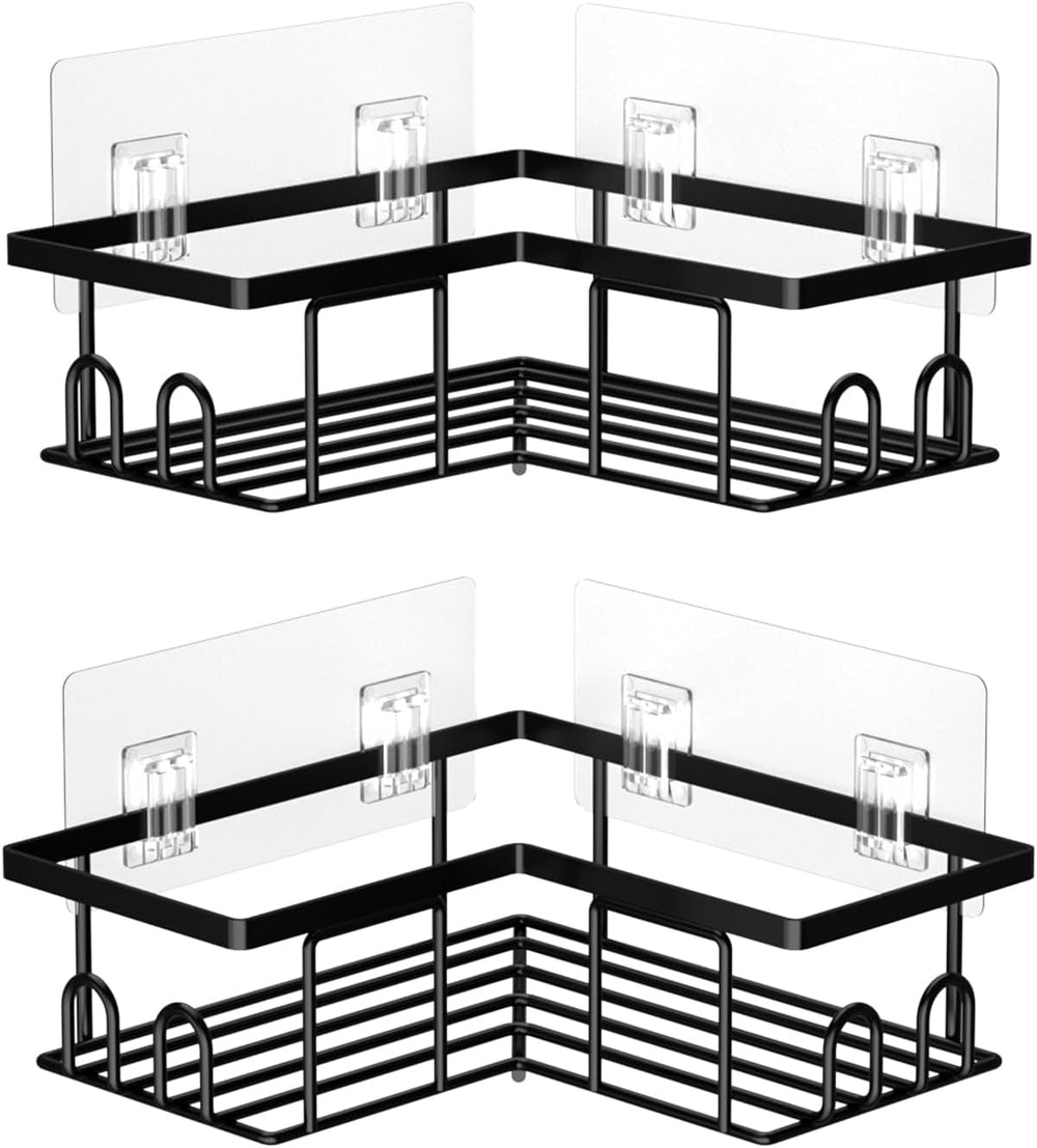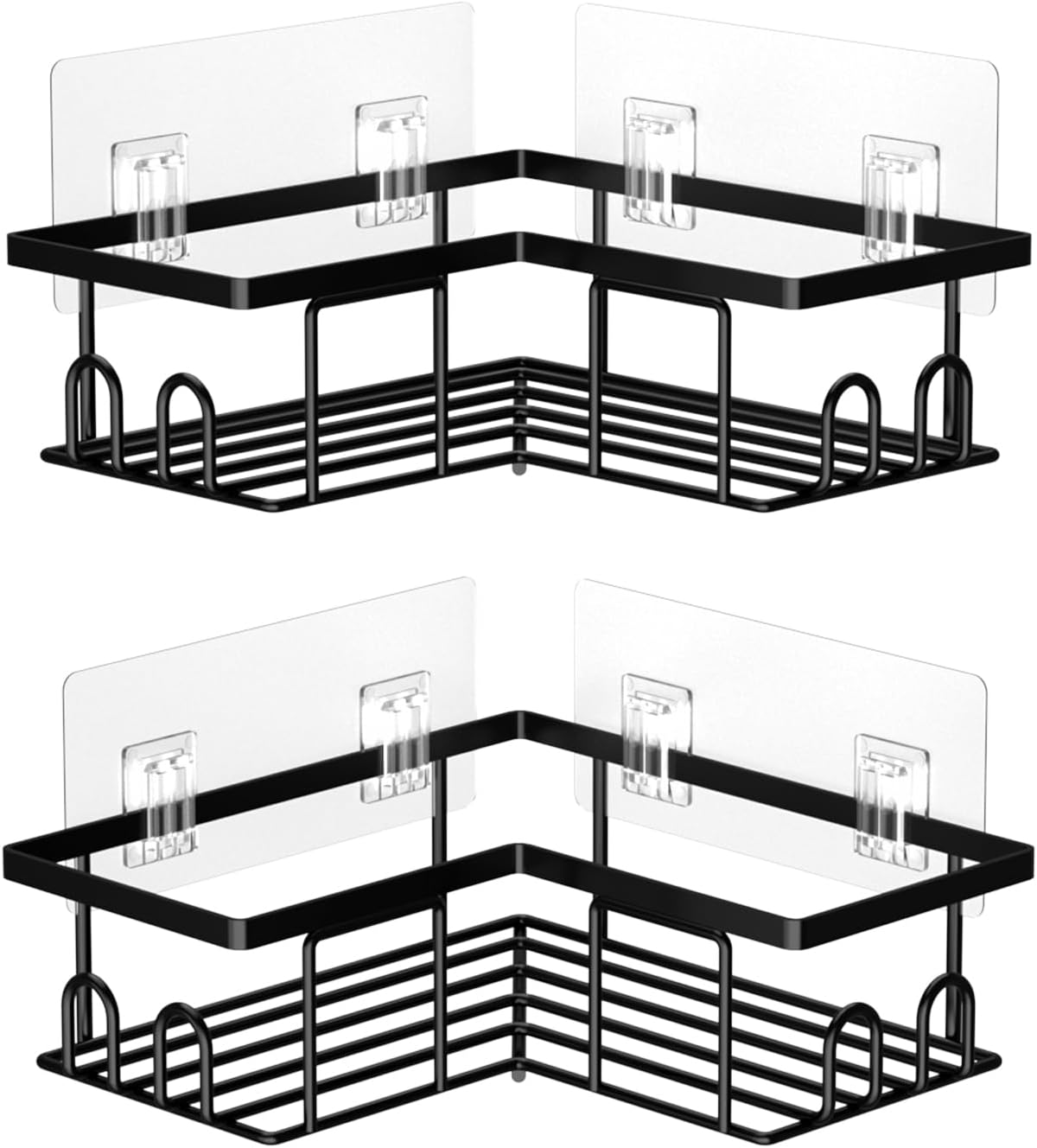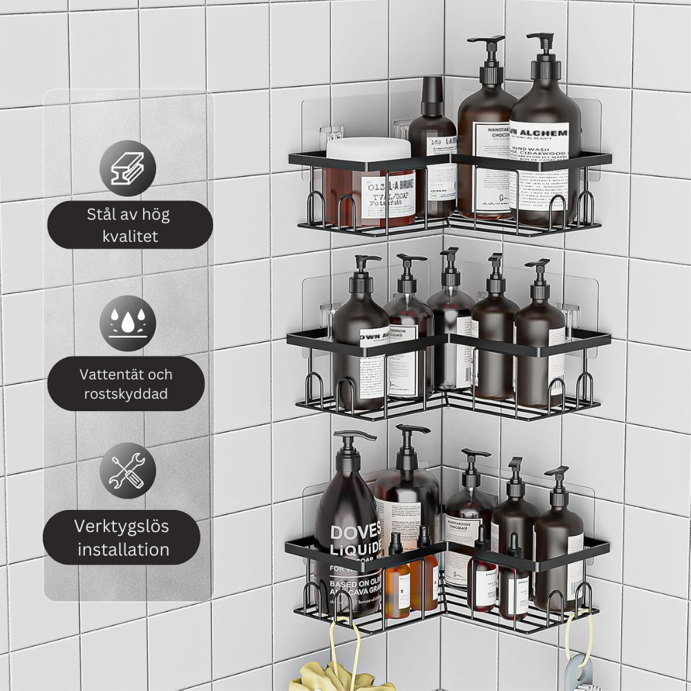 Hörnhylla för dusch som kombinerar modern design med praktisk funktionalitet. Den självhäftande konstruktionen gör monteringen enkel och skonsam mot väggar, medan den rostfria stålramen säkerställer långvarig hållbarhet – perfekt för badrum och kök.