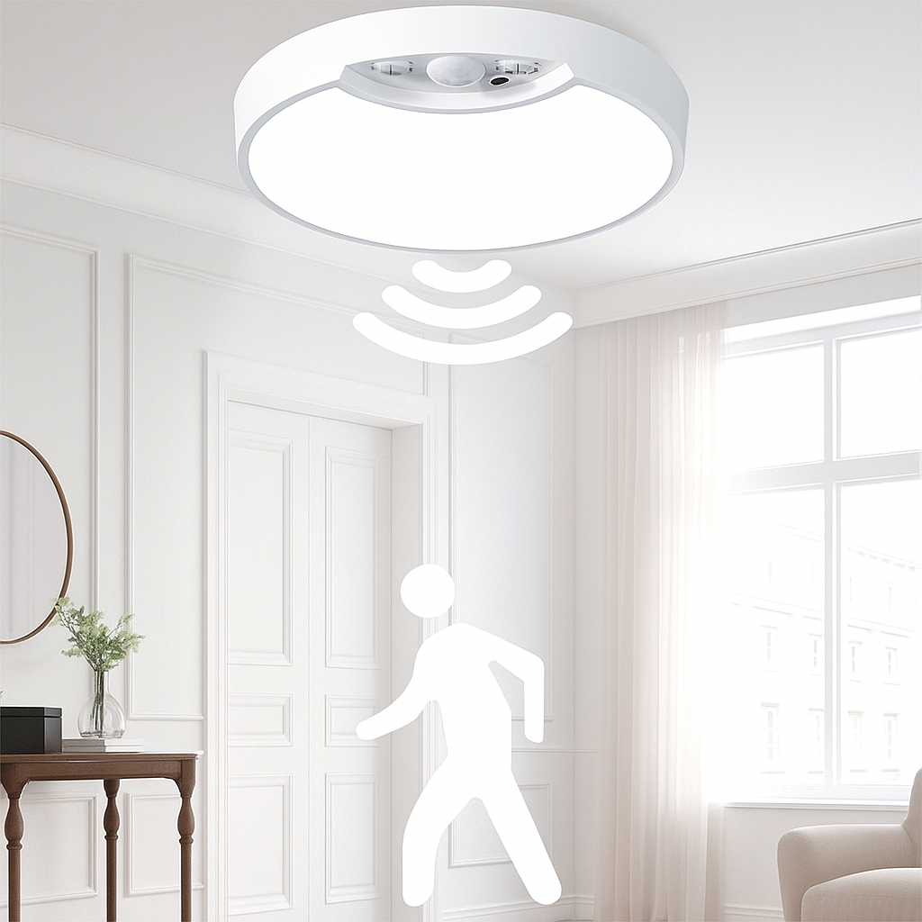 Smart LED-taklampa med rörelsesensor som tänds automatiskt när någon närmar sig. Den moderna, slimmade designen kombinerar säkerhet, komfort och energieffektivitet – perfekt för sovrum, hallar eller andra mörka utrymmen.