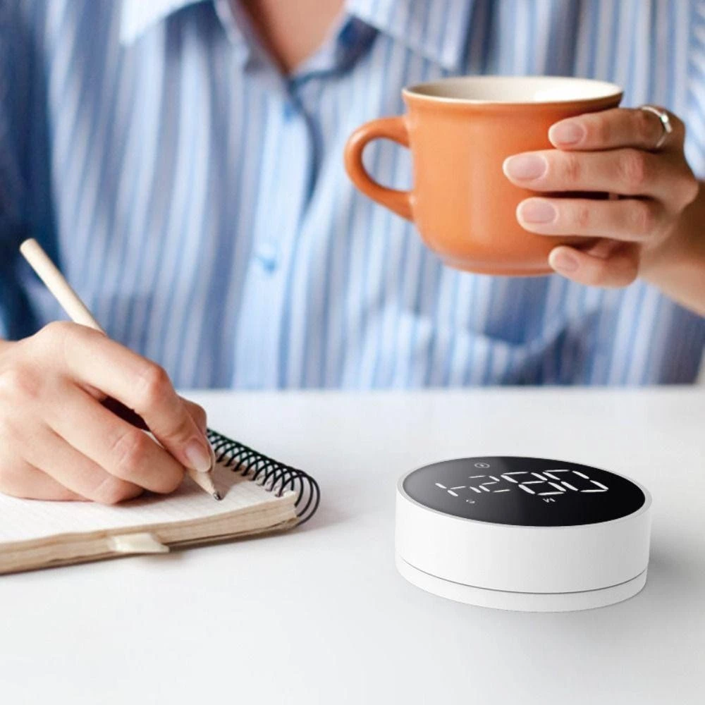 Denna timer har en elegant cirkulär silhuett med en slät, modern finish som passar i alla miljöer. En inbyggd magnetisk baksida gör att den fäster säkert på metalliska ytor och håller formen snygg och prydlig.