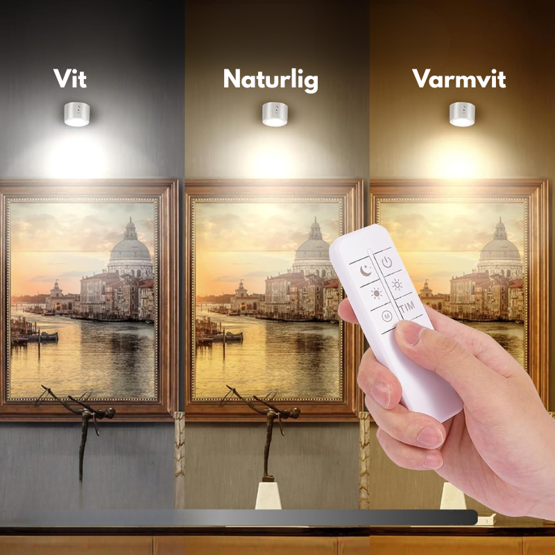 Styrning: Fjärrkontroll med dimning, timer (0,5 tim / 1 tim / 2 tim) och strömalternativ