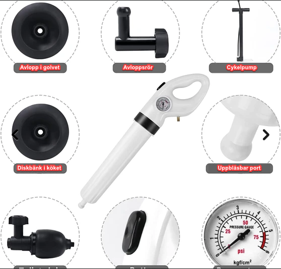PowerDrain – Tryckdriven rör- och avloppsrensare som kombinerar kraft, precision och användarvänlighet. Den ergonomiska designen och tryckmätaren gör det enkelt att anpassa trycket för olika typer av blockeringar. Med flera utbytbara munstycken kan du effektivt rensa allt från toaletter till köksavlopp – snabbt och utan kemikalier.