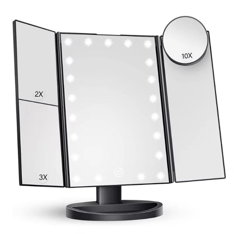 En vikbar LED-sminkspegel med tre paneler och elegant belysning. Den kombinerar modern design med funktionell precision för en klar och jämn spegling, perfekt för vardaglig användning eller professionell makeup.