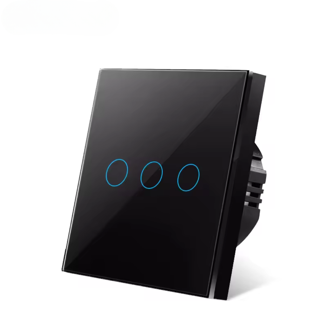 En WiFi-aktiverad väggbrytare med modern glaspanel och exakt touchkontroll. Den kombinerar elegant estetik med smart funktionalitet för att skapa en sömlös och stilren upplevelse i varje rum.