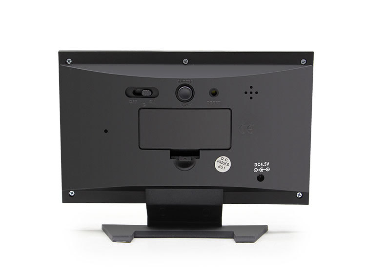 Klockan står på ett rent, vinklat stativ som håller skärmen lutad för en tydlig och enkel visning från skrivbordet. Den breda basen ger ramen ett snyggt och stabilt utseende.