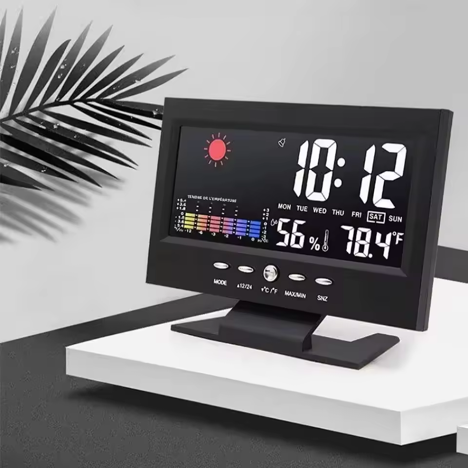 En färgskärmsklocka med stor LCD-display som visar tid, veckodag, temperatur, luftfuktighet och väderikoner i en tydlig och modern layout. Den står på en stabil bas och kan drivas via batteri eller USB-kabel för att ge en ren och stilren visningspanel i hemmet.