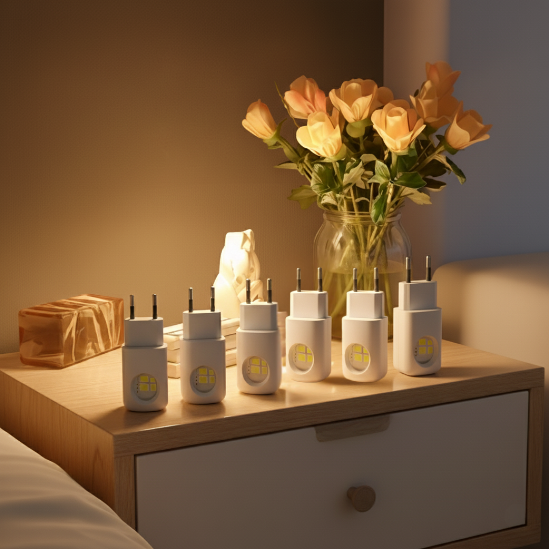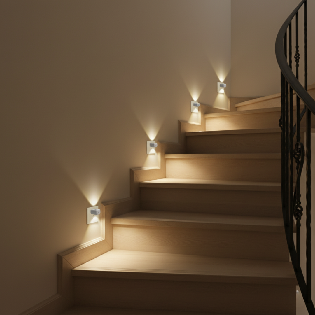 En smart LED-nattlampa designad för att reagera naturligt på omgivningen. Med inbyggda rörelse- och ljussensorer aktiveras den bara vid behov och släcks när den inte behövs, vilket balanserar ljus och effektivitet.