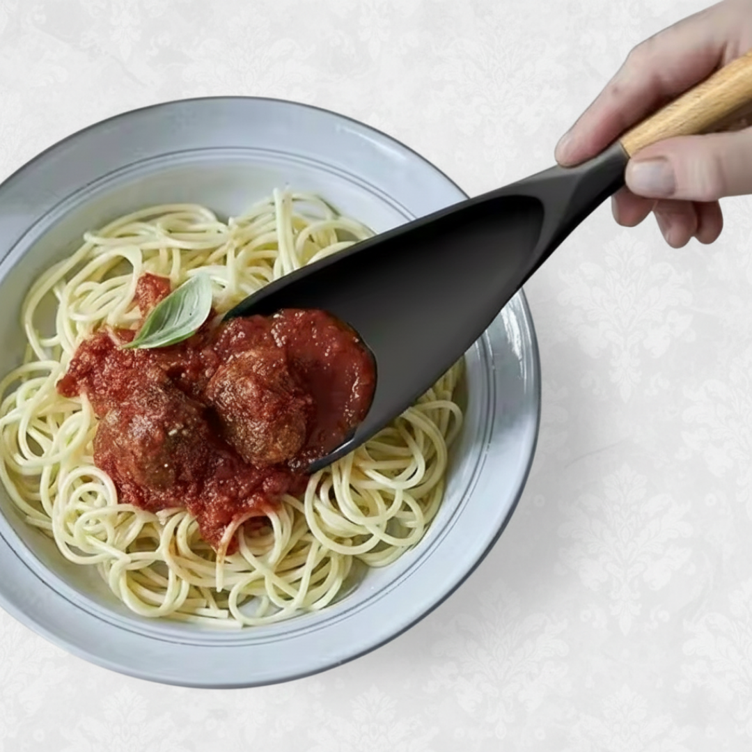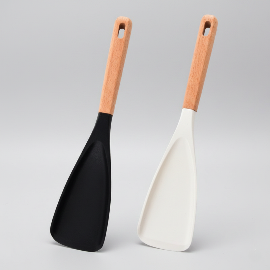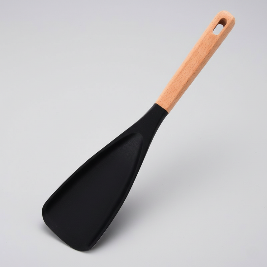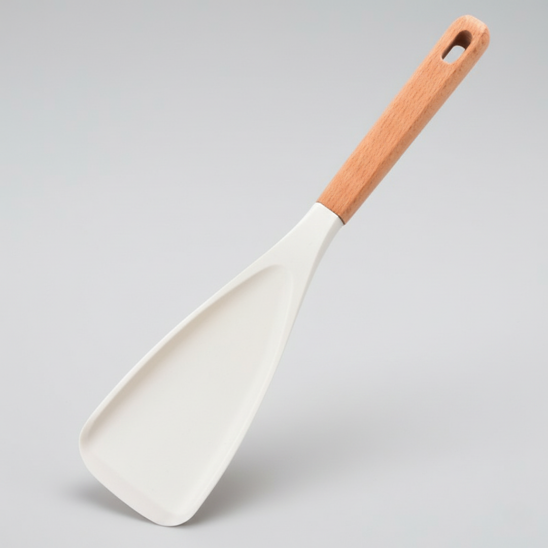 En köksspatel i modern och minimalistisk design som kombinerar en matt silikonhuvud med ett handtag i bokträ för ett rent och balanserat uttryck. Utformningen fokuserar på tydliga linjer, värmetåliga material och en välavvägd form.