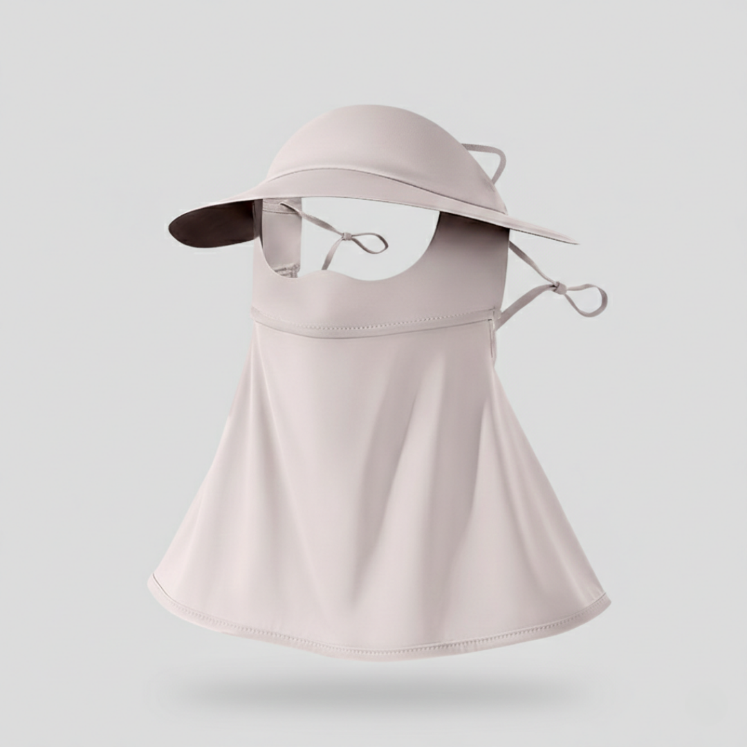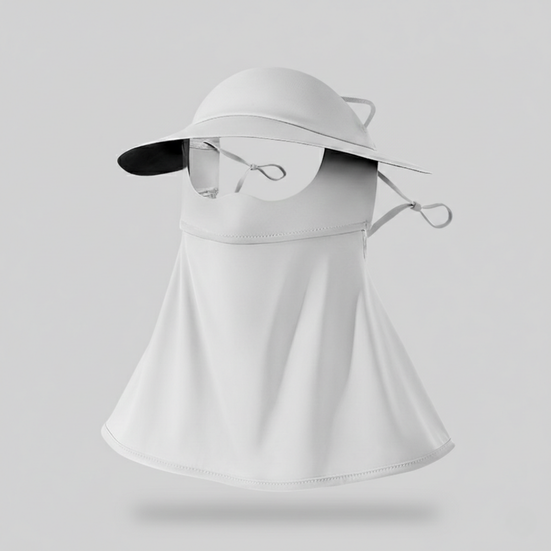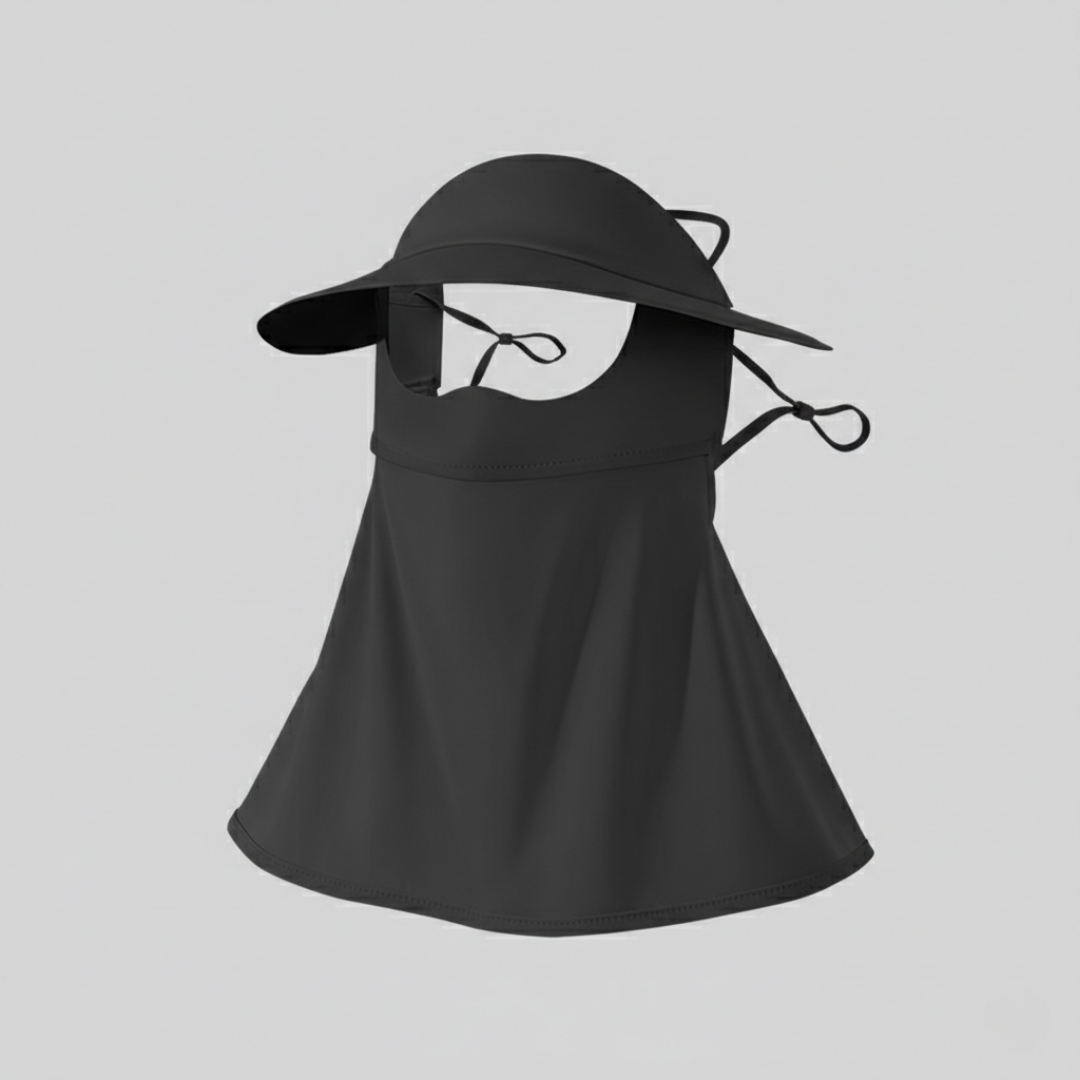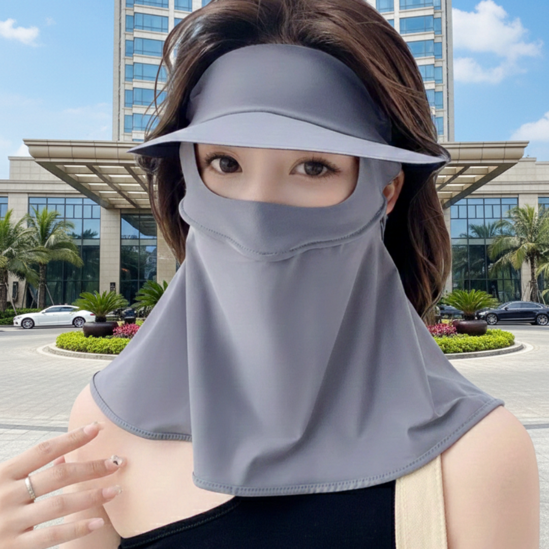 Ett heltäckande solskydd för ansiktet med en strömlinjeformad, modern profil som kombinerar täckning för ansikte och hals i ett enda lätt stycke. Tillverkat av ice silk-nylon med en slät finish och utformat med bred skärm och förlängt fall för jämn täckning i varmt väder.