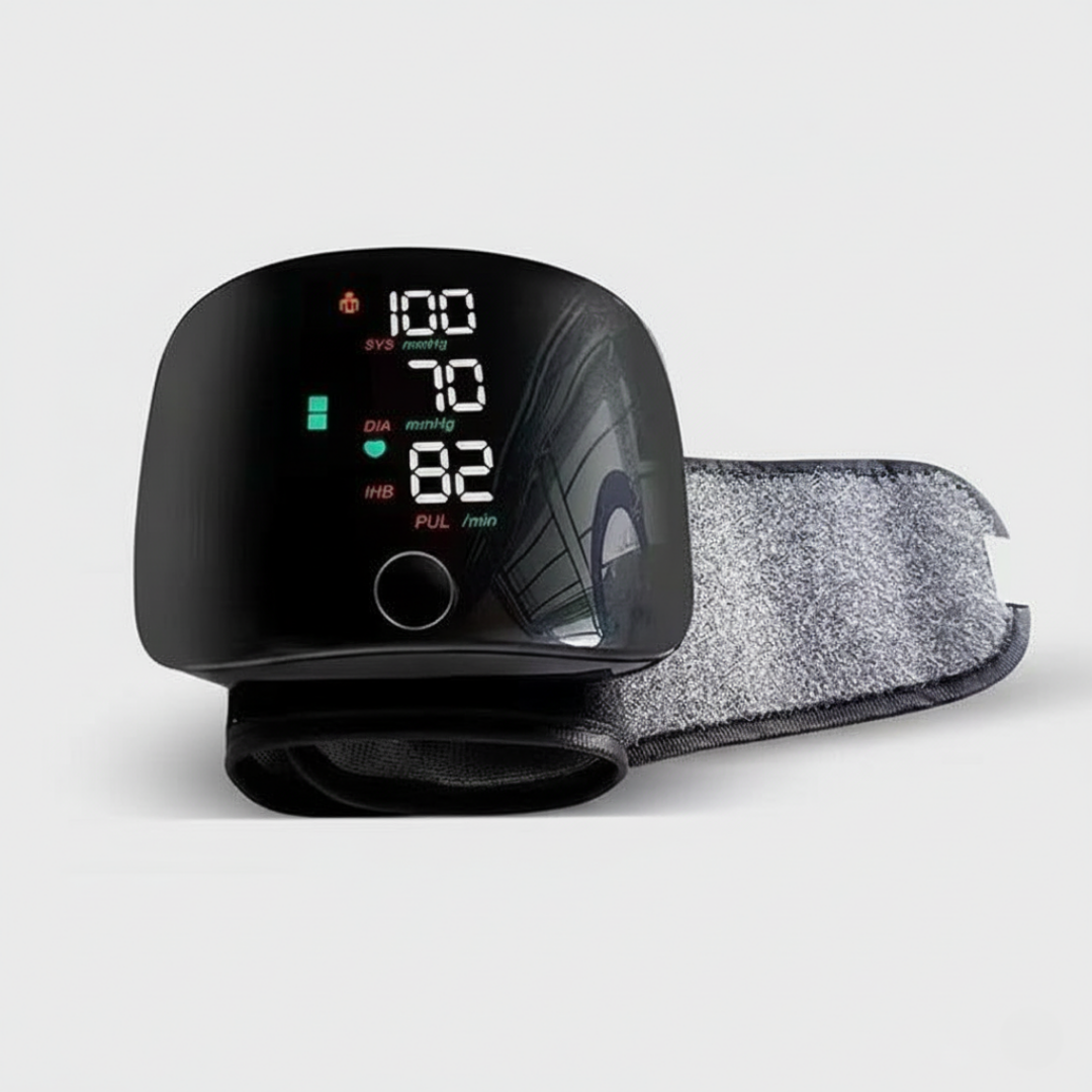 En handledsburen digital blodtrycksmätare med kompakt och modern utformning som kombinerar en böjd skärm, tydlig visning och en förenklad knappstyrning. Enheten är utformad med ett integrerat armband, digital display och ett helautomatiskt mätsystem i ett sammanhållet format.