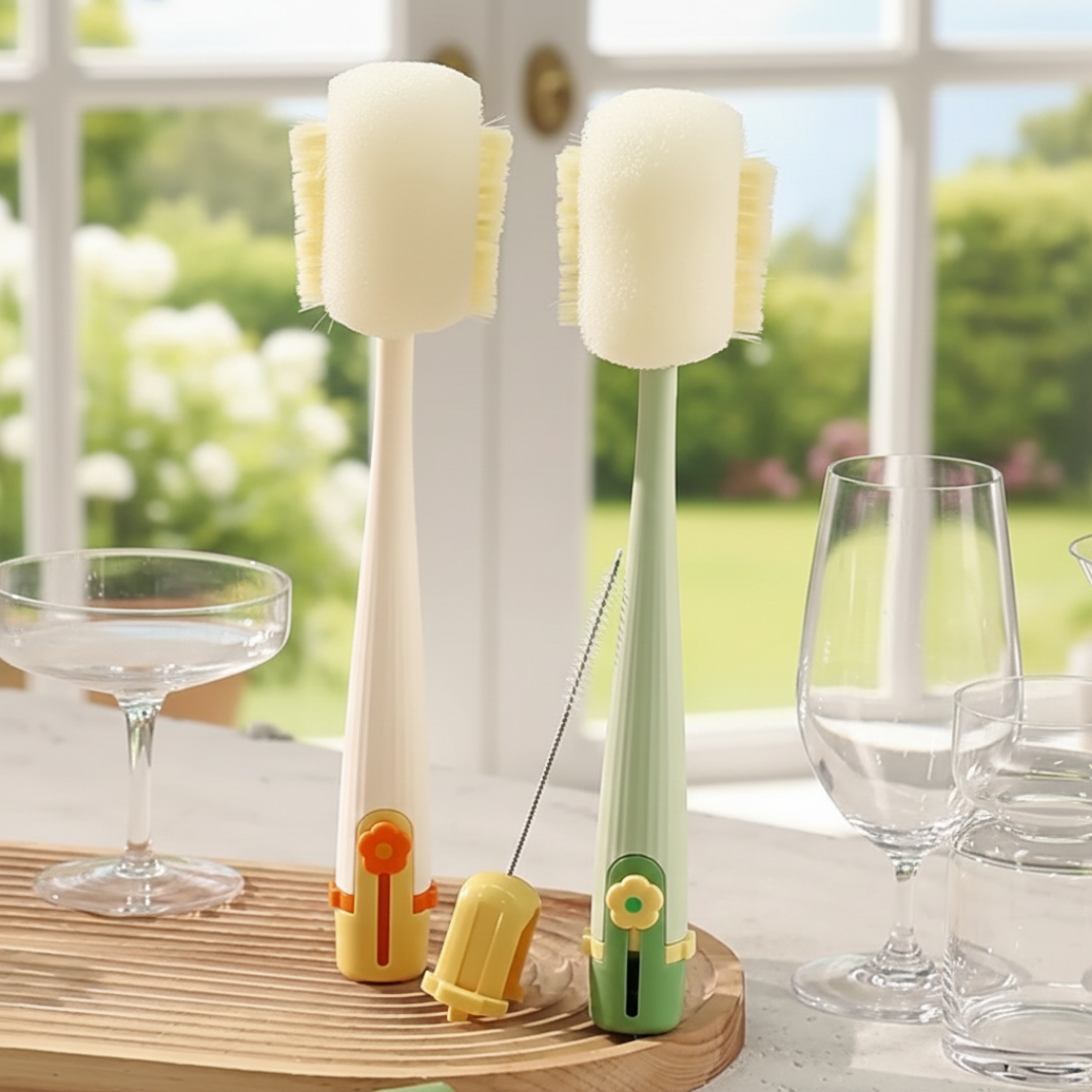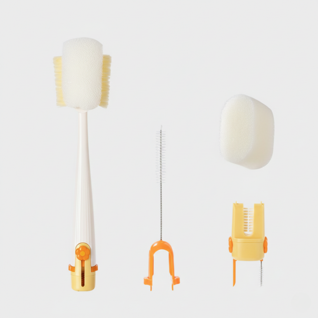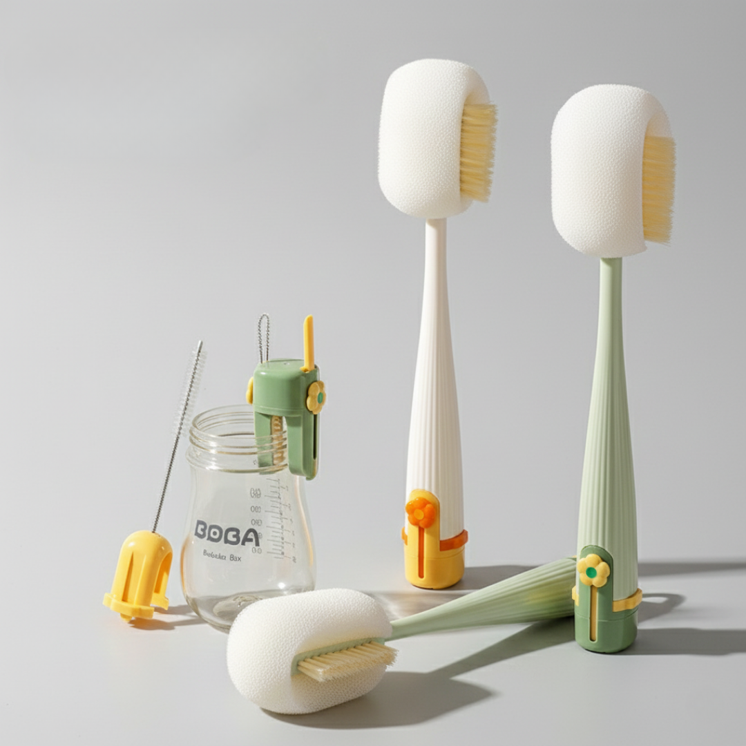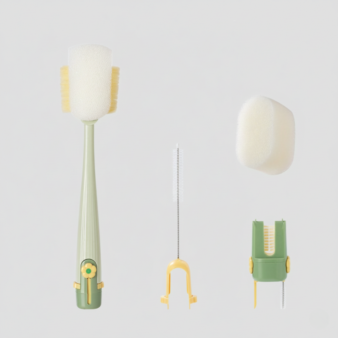 En fem-i-ett koppborste i genomtänkt och modern design som kombinerar ett långt handtag med utbytbara borsthuvuden i ett kompakt format. Konstruktionen samlar flera rengöringsdelar i ett enhetligt verktyg med rena linjer och ett platsbesparande utförande.